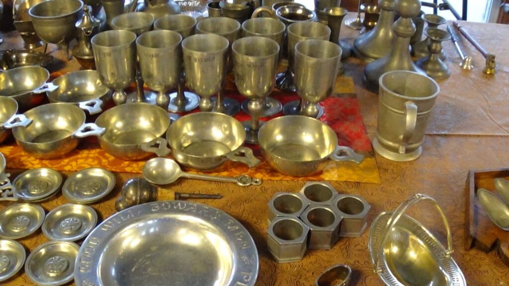 Included in the collection are hundreds of pewter pieces, numerous pepper grinders, some with and without the matching salt shaker, nutcrackers, and the most beautiful custom table and bench set made of old church pews you will ever see.